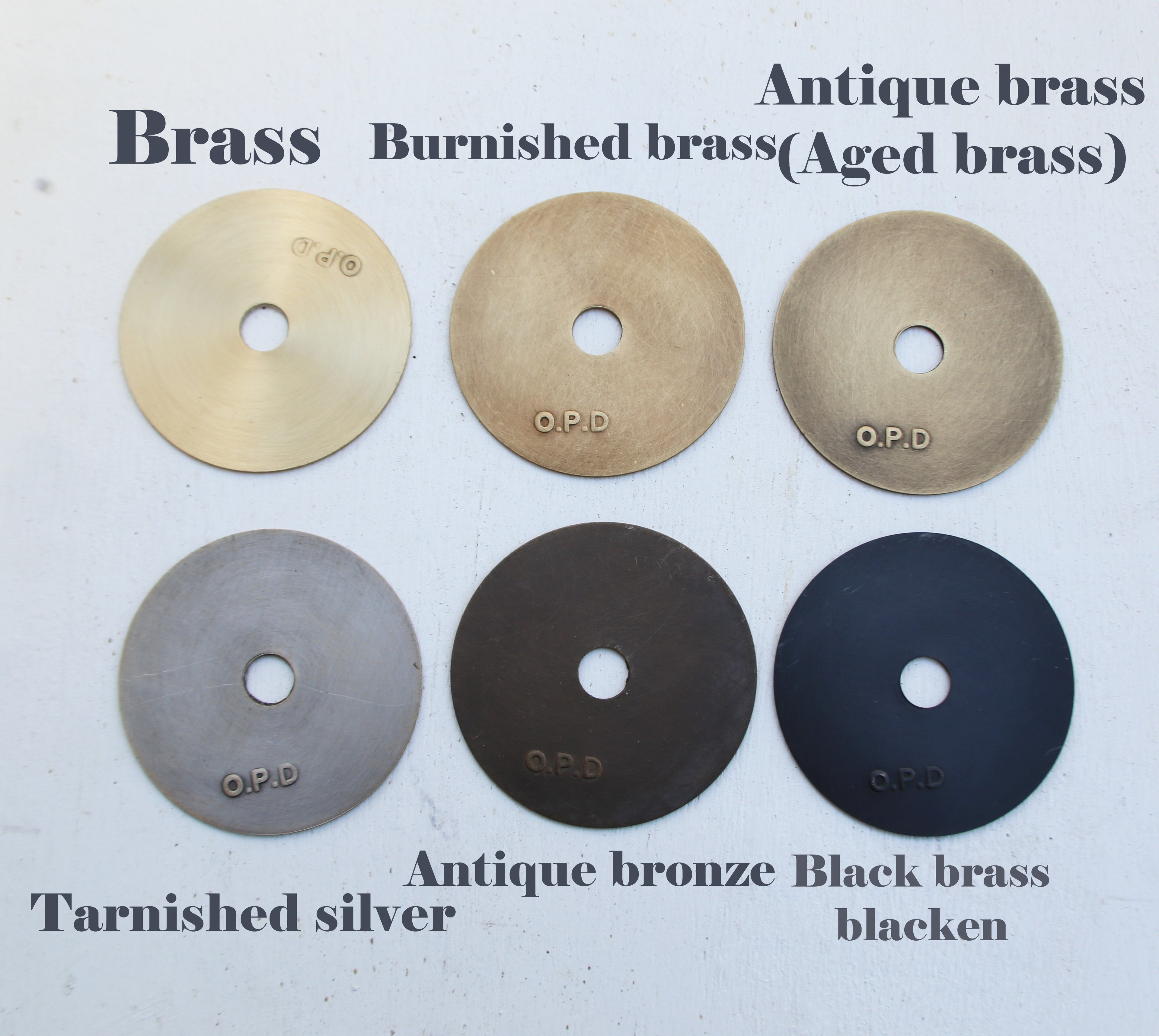 The colors from light to dark are brass finish, burnished brass, antique brass, antique bronze and brass blacken.